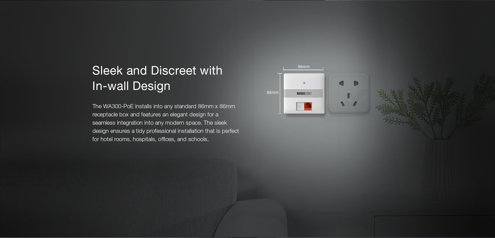 The WA300-PoE installs into any standard 86mm x 86mm or 77mm*77mm receptacle box and features an elegant design for a seamless integration into any modern space.