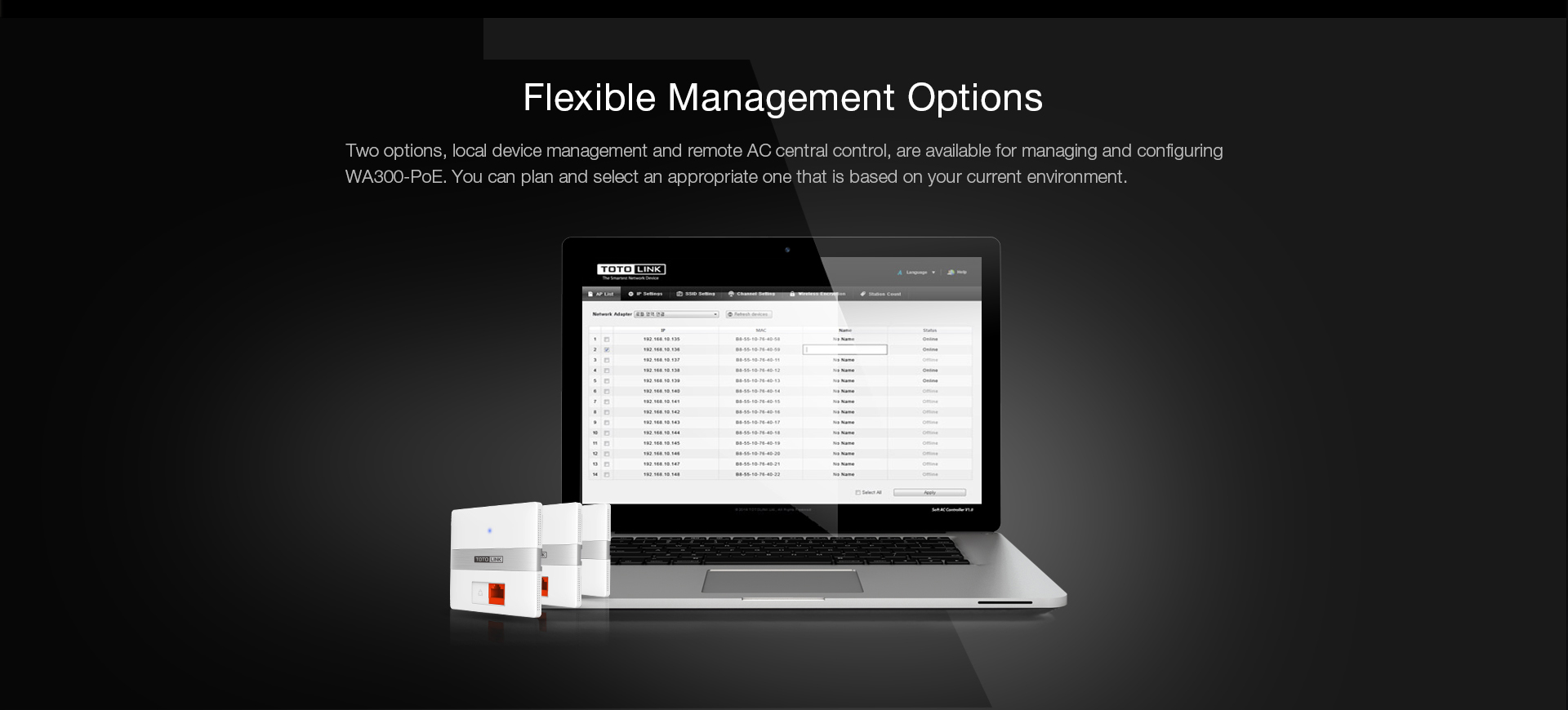 Two management options are provided, allowing both local management and remote AC central control.