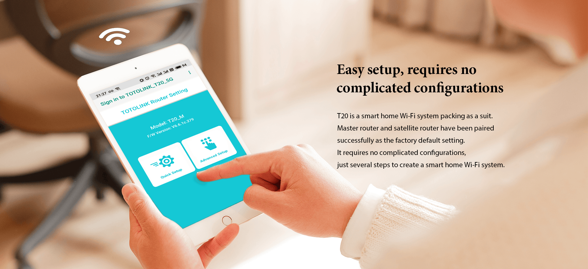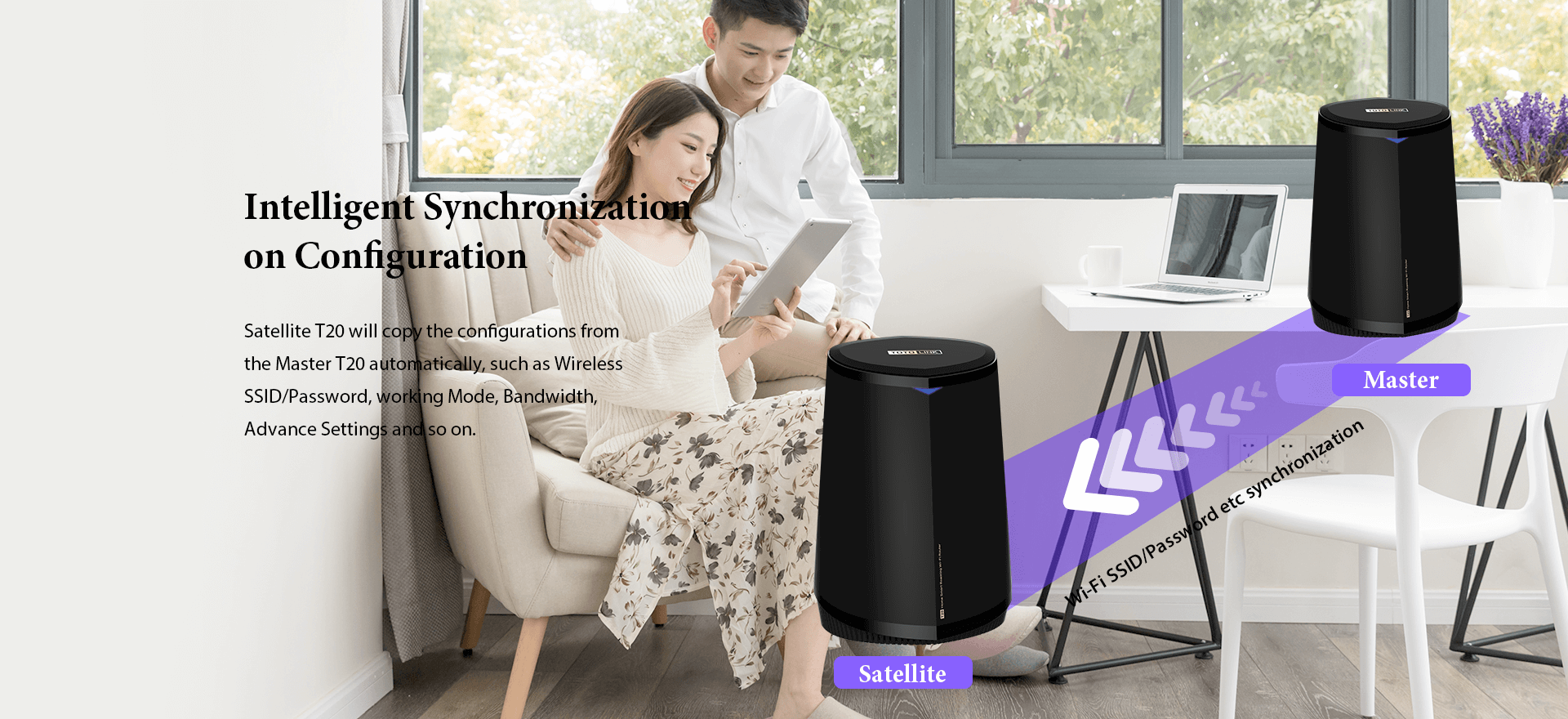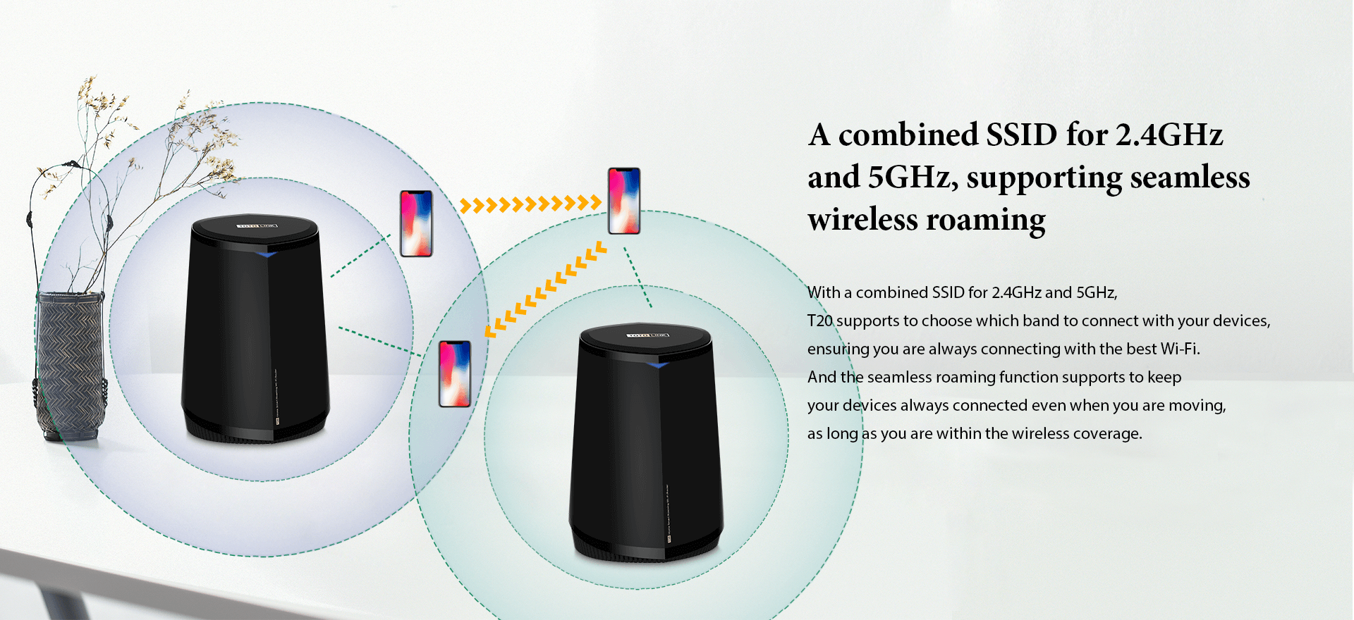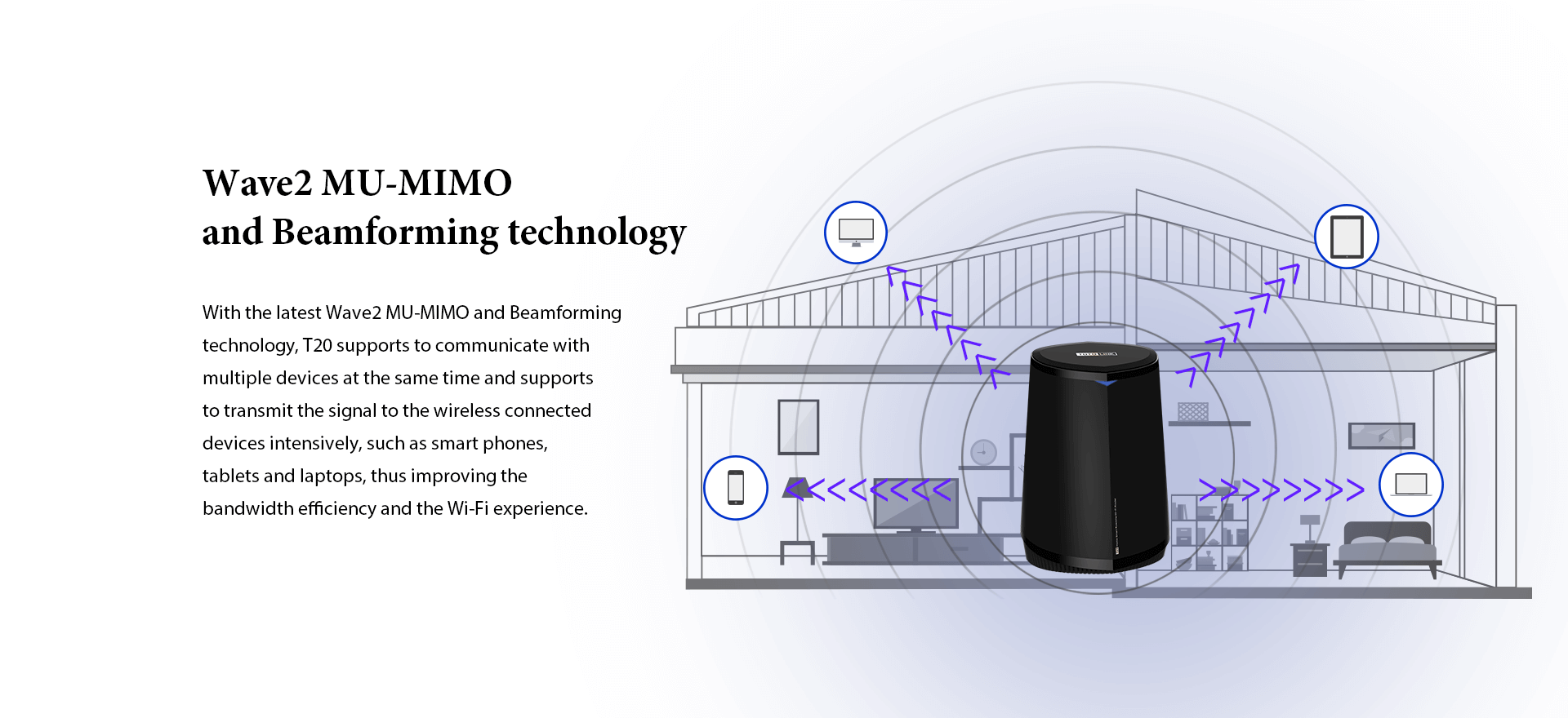 Meanwhile, T20 supports MU-MIMO technology, delivering wireless signal on 2.4GHz and 5GHz with a combined SSID, easily achieving the seamless roaming.