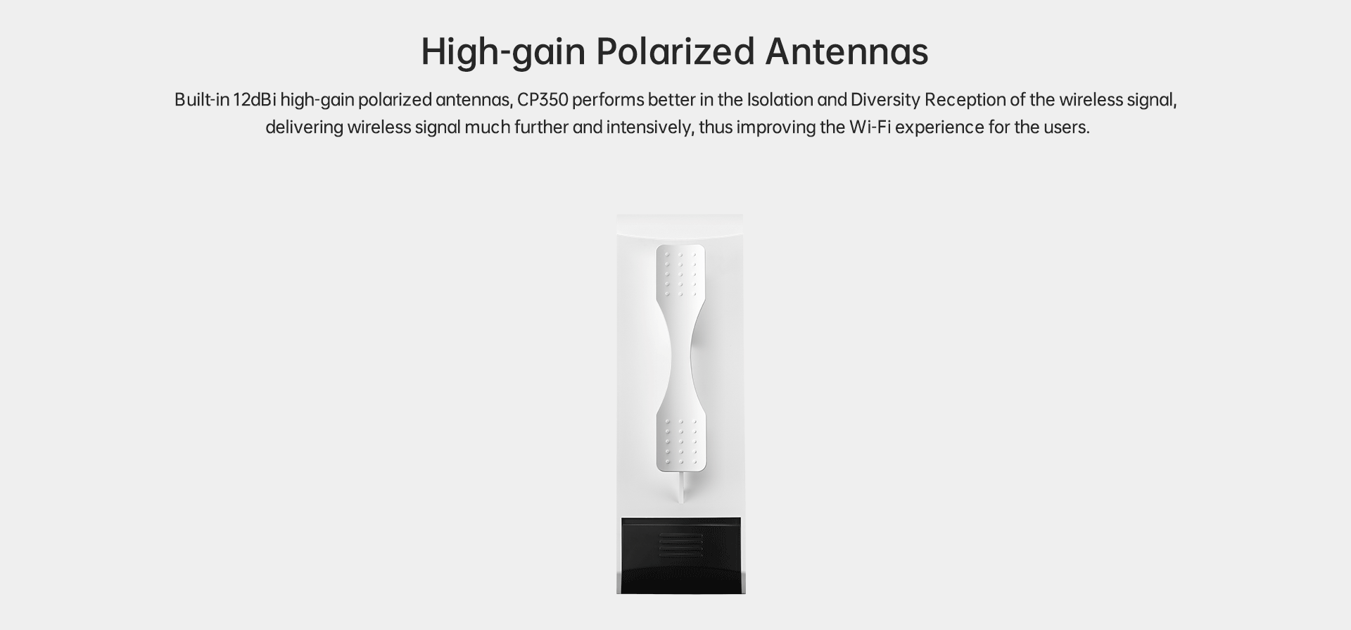 With built-in high-gain polarized antennas and advanced radio architecture, CP350 supports point-to-point transmission, point-to-multipoint transmission and wide range outdoor wireless coverage.