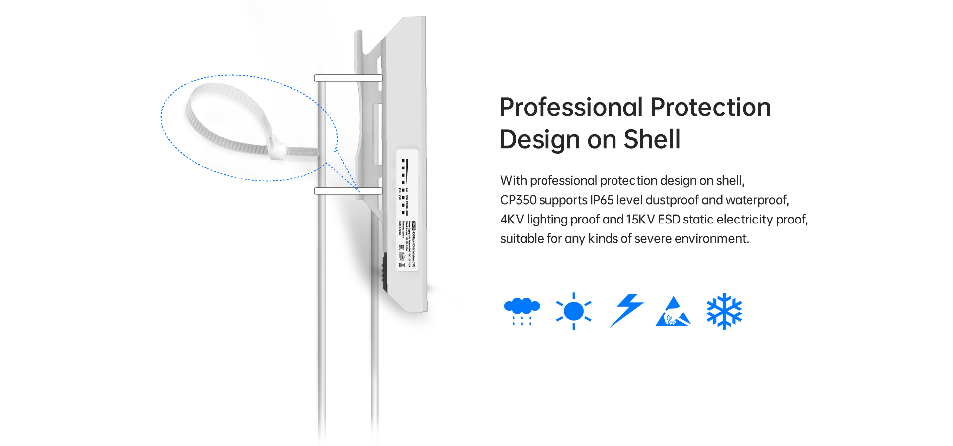 CP350 Wireless Outdoor CPE is specially designed for outdoor wireless transmission in villages, factories, parks, public squares and other outdoor areas.