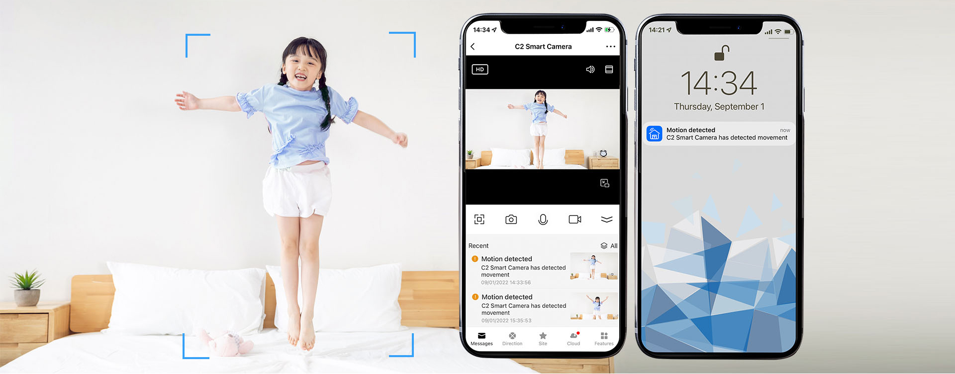 Based on AI deep learning algorithms, when a person or object movement is detected, the APP warns in real time and stores the video to memory card or cloud storage. |